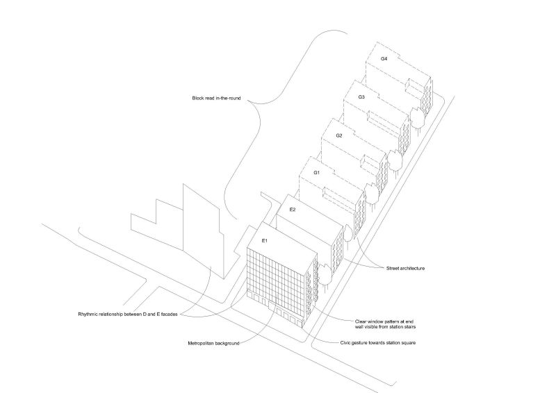The building is oriented to provide a strong urban frontage to Freemasons Road and Station Square; shape a communal garden and contribute the street rhythm of Ethel Road and Leslie Road.