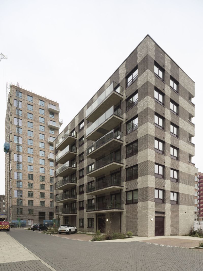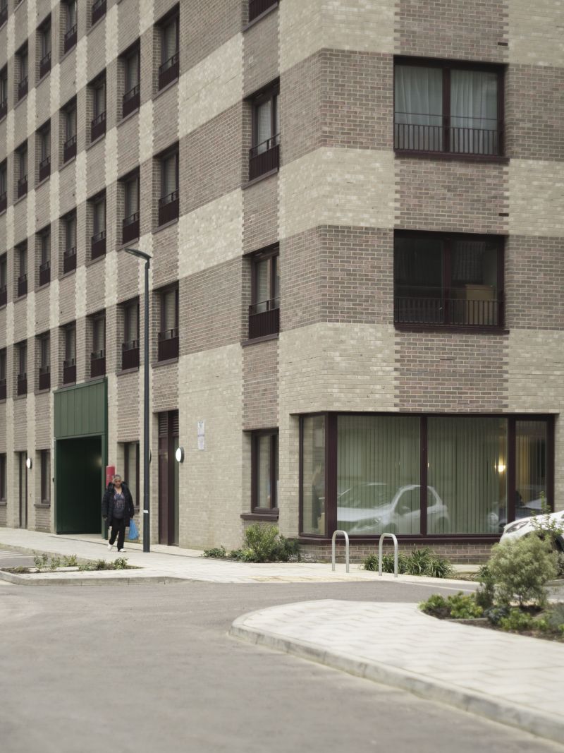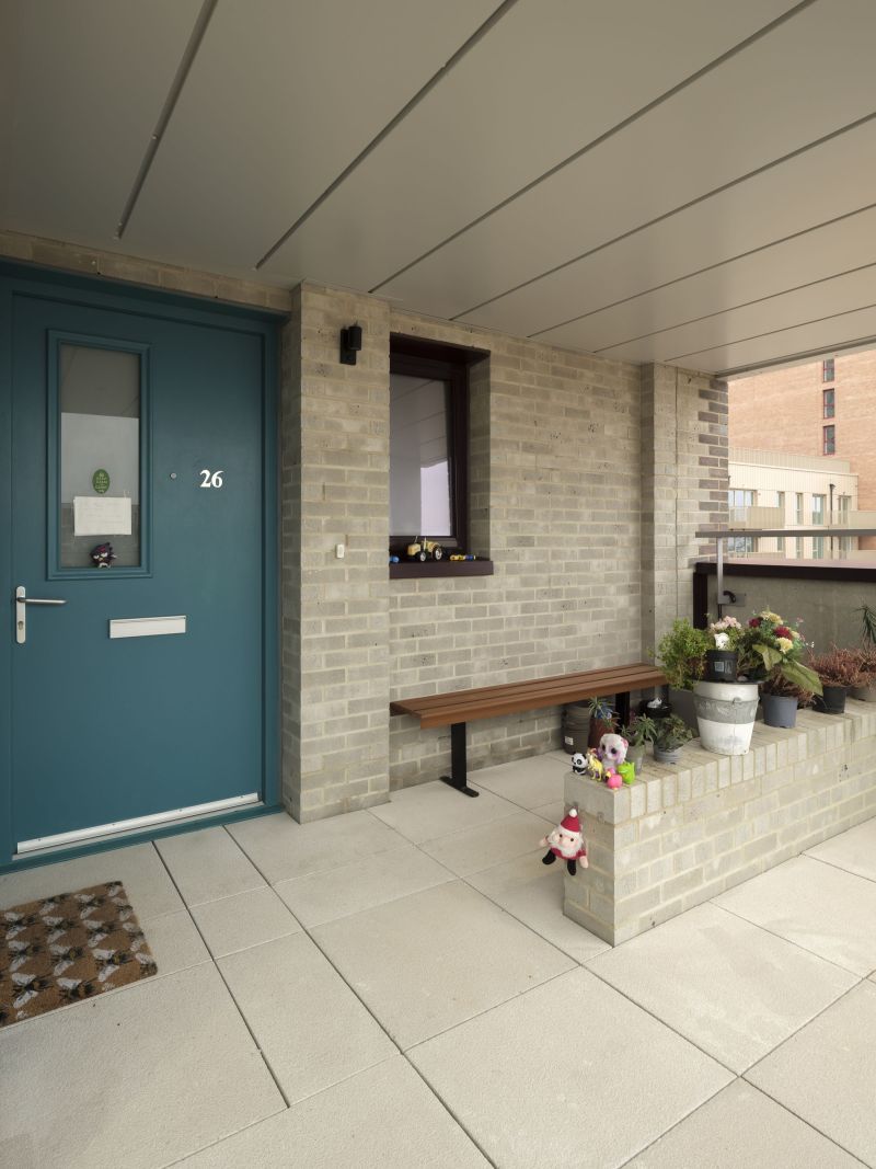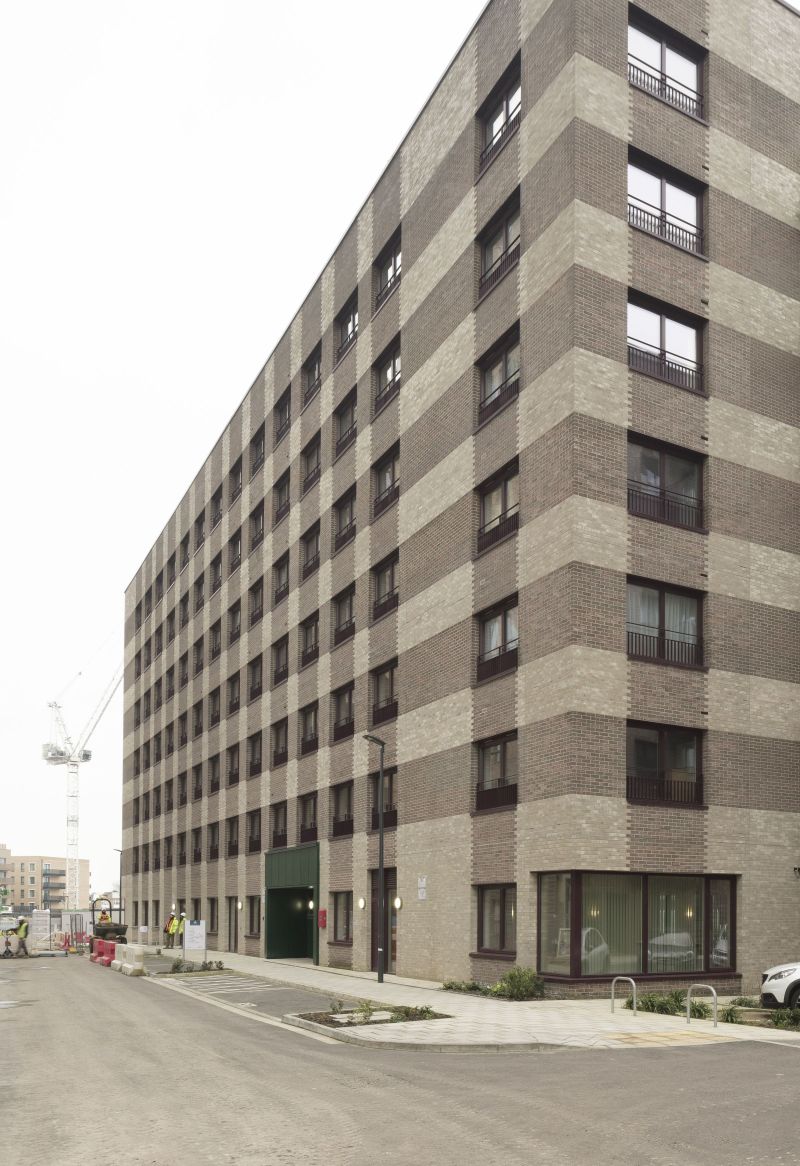 Barratt London’s brief to us was to design an Extra Care building with a flexible generic layout. The building is composed of sixty dual or triple aspect units, of which fifty-eight are one-bedroom units and two have two-bedrooms. The elevation is patterned like a warm protective blanket. The dwellings are distributed by a generous, external southern walkway facilitating orientation and sociability for residents. The ground floor is dedicated to communal uses for the extra care residents and organised around a green, southerly oriented communal garden.