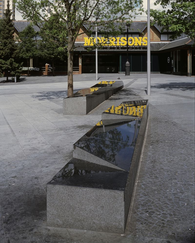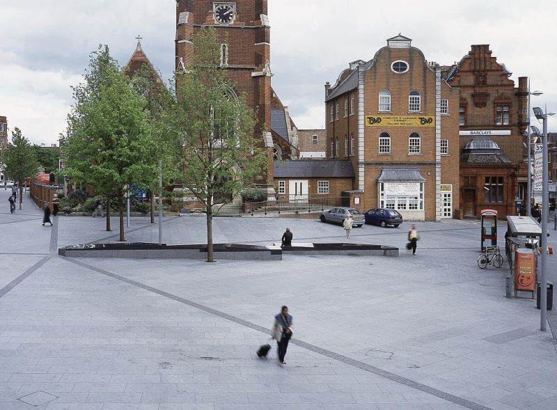A robust urban space stretches between clearly defined boundaries on three sides, next to a church, supermarket and pub. New plates of granite clad the sloped ‘Kings Mount’, highlighting the presence of the hill and enabling a new market and more public events to thrive. Smaller, hand-shaped granite setts define the more informal spaces between the flat and large flagged plates of ground. New mature oak trees and LED tree lights bring civic weight to the space. A variety of architectures are brought together with equivalence, including a Morrisons supermarket which shares the space with St Marys Church. The award-winning Acton Town Square is one of the first of the Mayor of London’s 100 public spaces.