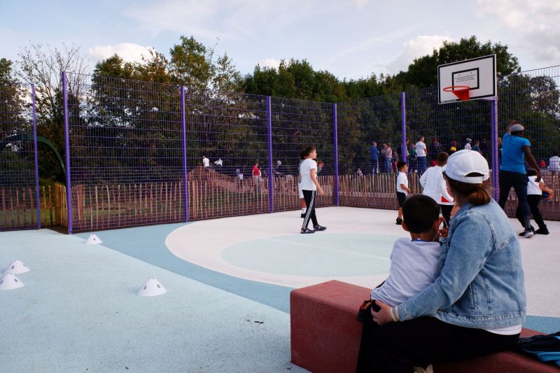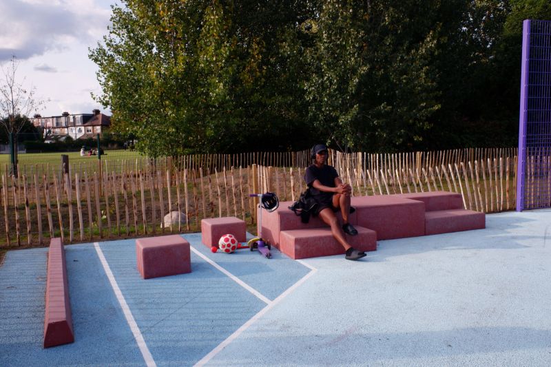 Existing fencing and play equipment have been refurbished, repainted and reused in new locations to provide engaging sequences of play across the islands, with new elements added, most significantly an innovative multilayered multi-use-games-area with space for multiple, sometimes made up, games to take place at the same time. The layered MUGA also includes seats and platforms to play on, sit on and socialise around.
