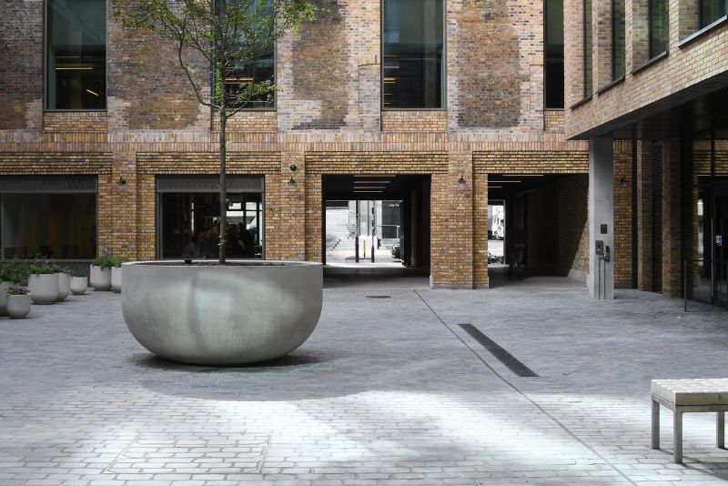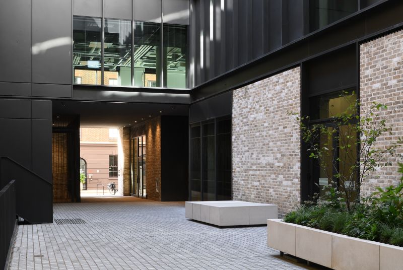 Norton Folgate includes a sometimes unnoticed and important aspect – the network of pub¬lic and private spaces that link the buildings and streets. East worked with British Land and each of the plot architects from the outset to ensure a meaningful and calm public realm. We made use of existing materials, reused split and honed granite setts, in courtyards and streets, and where appropriate we located some special pieces, a large tree, a seat – minor foreground moments. The spaces are generally spliced into the background of the city. We believe that the network of streets and spaces give amenity and allow spatial choices for people to walk, meet, sit and experience this amazing, layered and rich part of London.